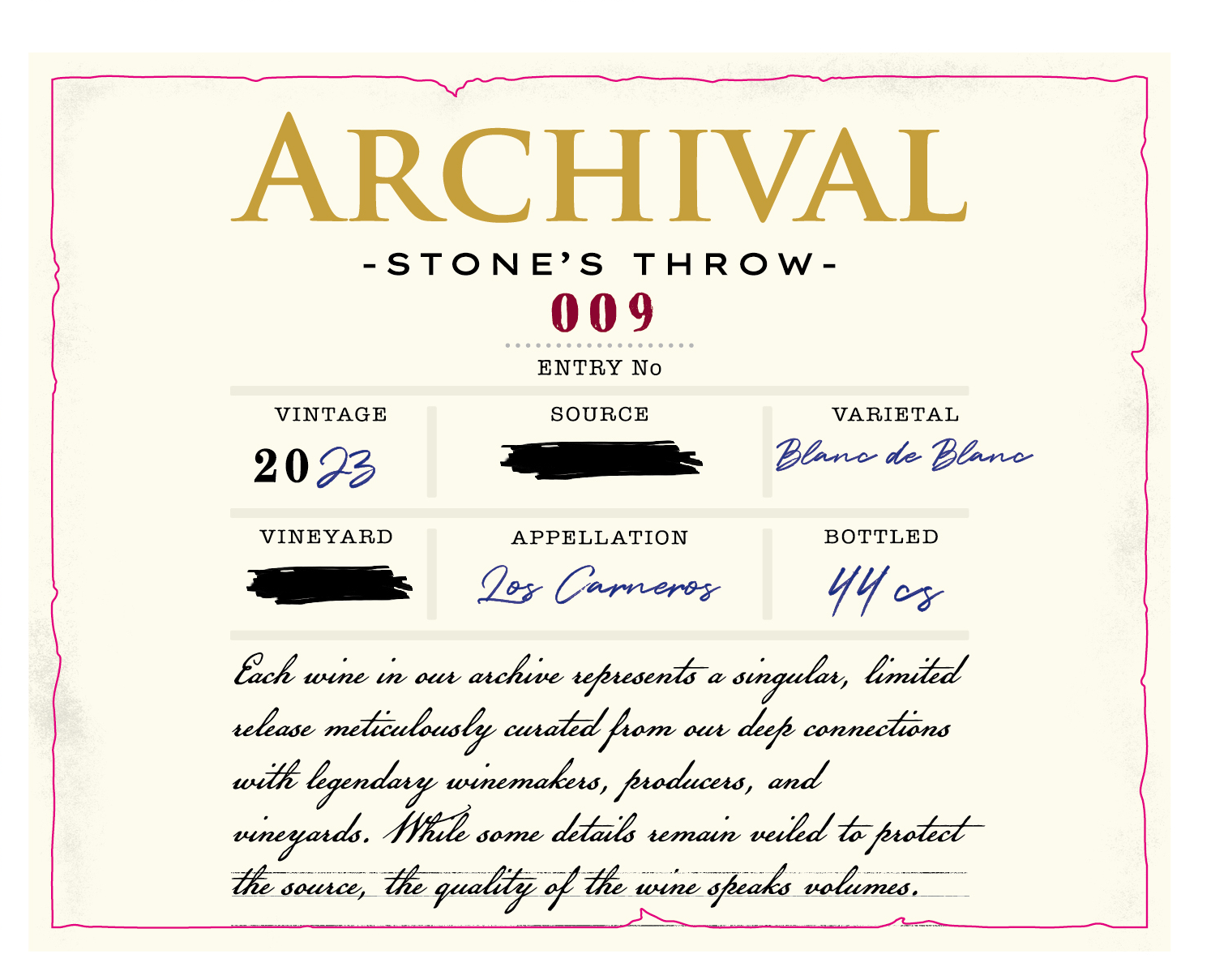 Our first white is here! And it’s the bubbly kind. There are few things finer in this world than a great Champagne or well-made sparkling. “Wine gives one ideas, whereas Champagne gives one strategies” said Roman Payne. This is definitely one to plan conquests with, whether you’re formulating your next move in Catan or simply looking for WOTN against some grower offerings from the motherland, Champagne. 2023 was truly a remarkable vintage, and I say that without hyperbole. The “base wine” for this sparkler comes from a single vineyard so special it deserves to remain veiled. Bring a wine consultant who crafted many esteemed cuvées at Schramsberg for 12 years into the picture, and you end up with some bubbles that rival many a Grand Cru from the motherland. As we tasted various lots, some were mediocre, others worth a raised-eyebrow, and one earned a definitive, eye-popping “YES” – that was with “no dosage” when we tasted it. After 15 months “en tirage”, this had developed into something beautiful. We locked it down, and then came the next move: dosage trials. Mike and I tend to favor a drier style – less dosage, more tension. This wine flat-out rejected anything above Extra Brut, finally finding its voice at 3.5 g/L. As a still winemaker, the dosage trial process was a revelation. It’s not linear, a touch more or less sugar can completely reshape the wine, accentuating the palate or lifting the aromatics in ways that surprise you. For me, the soul of a great sparkling wine lies in its aromatics and finish. I admire wines that are razor-sharp and racy, as much as those rich in brioche and nuttiness. But when a Champagne has alluring aromatics and a finish that clings like my 6-year-old son at morning drop off, that’s when I’m hooked. This Blanc de Blanc finds its own balance: not esoteric and lean, nor broad and yeasty. It has just the right weight on the palate while staying brilliantly bright. Aromas of citrus blossom and gently baked apple rise from the glass, with perhaps some jicama or jackfruit mixed in there. That’s accented by wisps of nutmeg spice and river stones, all of which keep my nose lingering too long before I remember to take a sip. If we could bottle this as the next Chanel No., we would. For now, I’ll just remain awestruck between sips, and captivated by a finish that goes into extra-innings. It’s going to be hard not to squirrel away a few cases for myself. But with only 44 cases bottled, there simply isn’t enough to be selfish. For those newer to sparkling wines: “Blanc de Blanc” means a white wine made entirely from white grapes, in this case, 100% Chardonnay, the noblest of Champagne varieties. Not to slight Pinot Meunier or Pinot Noir, but I’ve always been captivated by the pure, crystalline expression of Chardonnay in sparkling form. This is, of course, made in the “Méthode champenoise”. It was disgorged on November 10 at approximately 9:30 am (for those who like precision in their wine notes). We know this because it was a fantastic way to start the week, as quality assurance was being done on the bottling line. We didn’t label this wine “Extra Brut,” though it technically sits in that 0–6 g/L range. The nomenclature can be arbitrary — so we chose to let the wine speak for itself. It lands right in the heart of that spectrum: bright, elegant, and endlessly inviting. This outperforms many Champagne and sparkling 2-3x the price. And being our smallest production to date, it probably won’t last long. Don’t tempt fate!